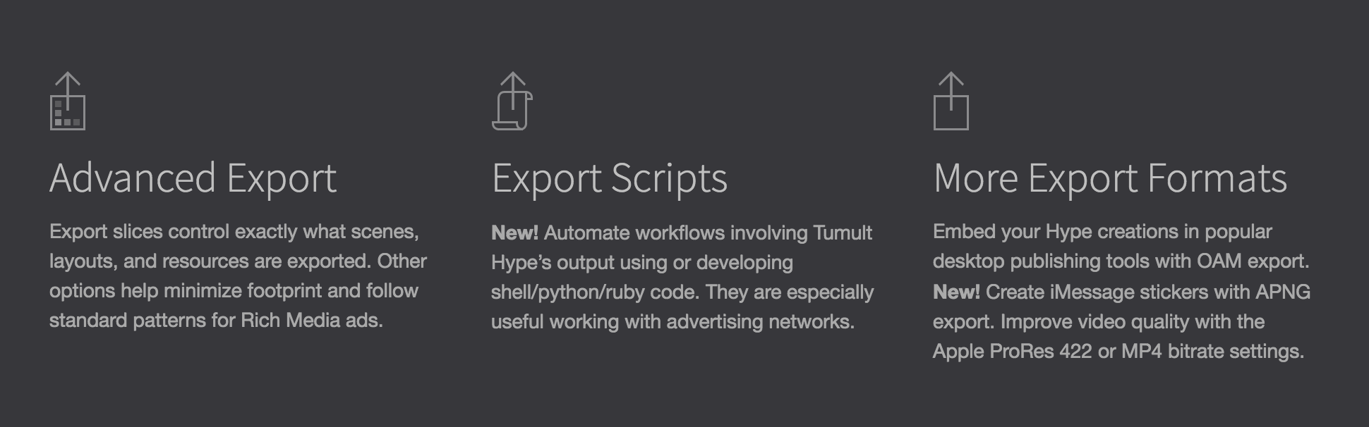 Probably one of the biggest pros for using Tumult Hype is the well thought through and use case oriented publish and export process. This not only helps minimize the footprint for a general optimized performance, but it makes this tool also first and foremost suitable for rich media ads with their strict restrictions. It also offers helpful ways to grant a smooth integration, for example through Adobe’s OAM packaging, so that entire compositions can easily be placed in InDesign, Dreamweaver or Wordpress etc. as a single file.