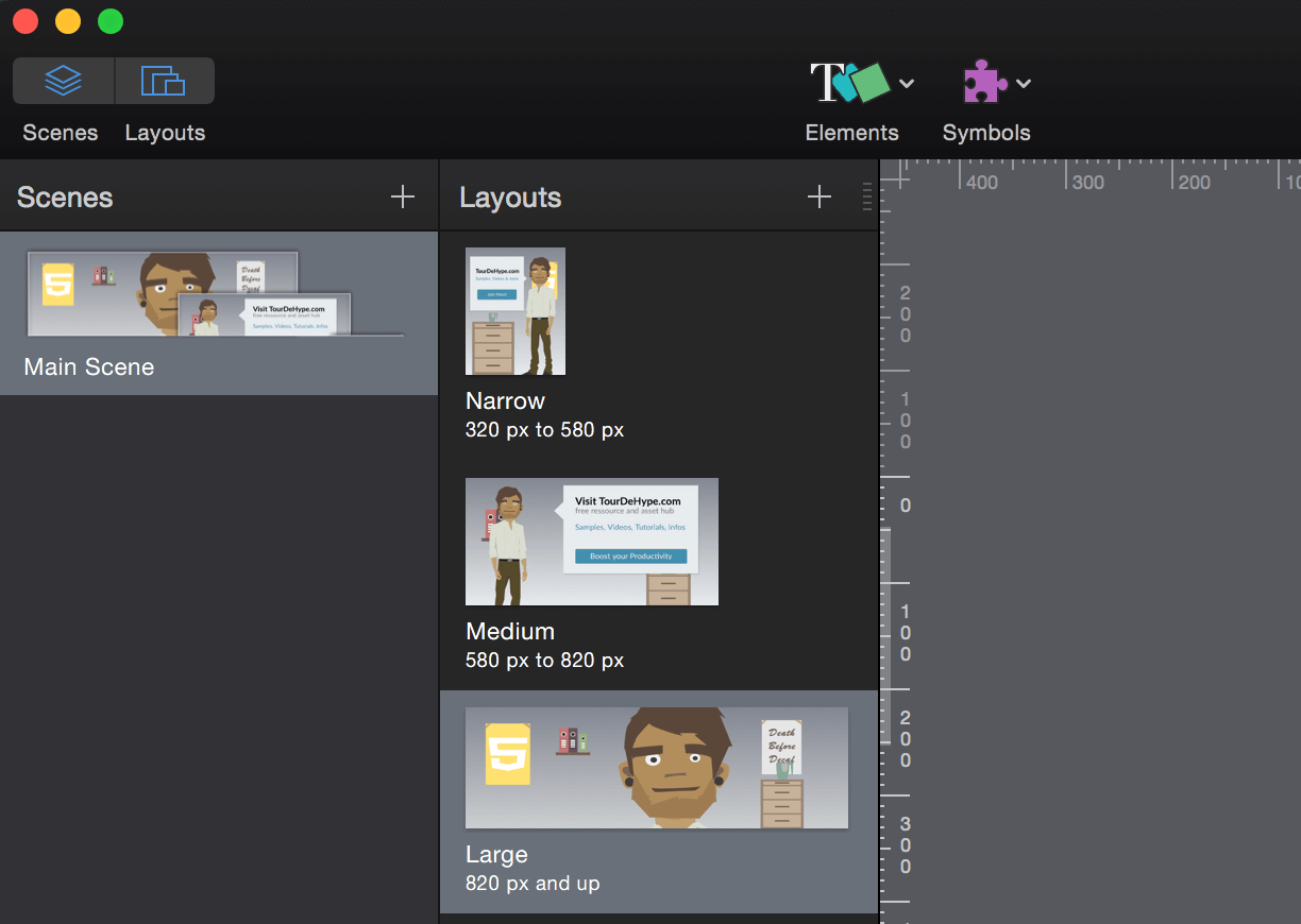 Especially for designers who are not yet well versed in the responsive paradigm the integration of these responsive features with visual support inside a user interface can help creating awareness for responsive issues in the first place. Similarly to layout issues, Hype will automatically make sure to load the right resolution required depending on the device pixel ratio, given that the assets used provide the quality necessary.